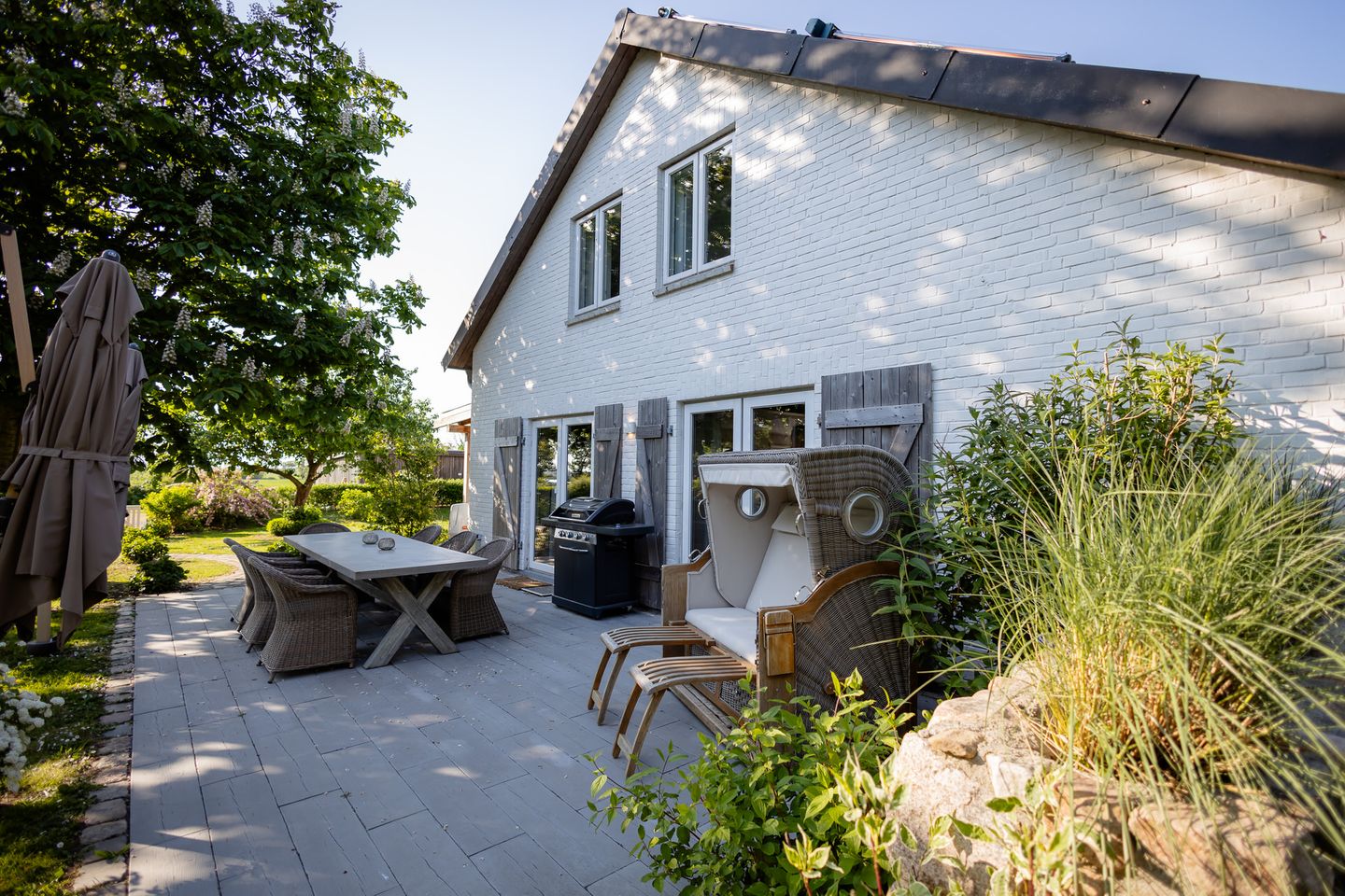 - Terrasse mit Grill und Strandkorb in den Sommermonaten