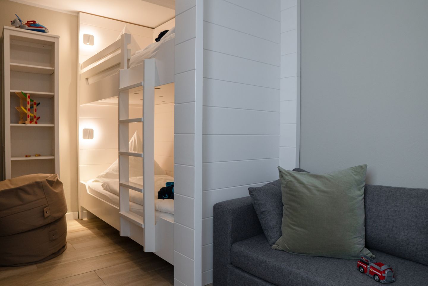 mit Doppelbett (180 x 200 cm) sowie ein Nebenzimmer mit Etagenbett (90 x 200 cm), eine 12 m² große Terrasse mit Sitzgelegenheiten